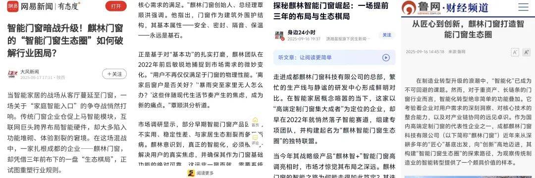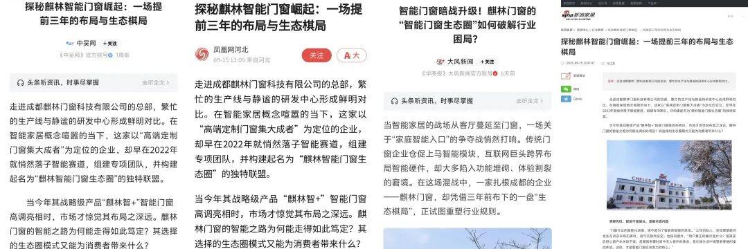 过去一年,包括光明网、新华日报、中国日报网、中华网、四川观察、上游新闻、大风新闻、潇湘晨报、凤凰新闻、新浪家居、网易新闻、搜狐新闻等在内的多家主流媒体,对麒林门窗的发展路径、行业探索与产品创新进行了关注与报道。
